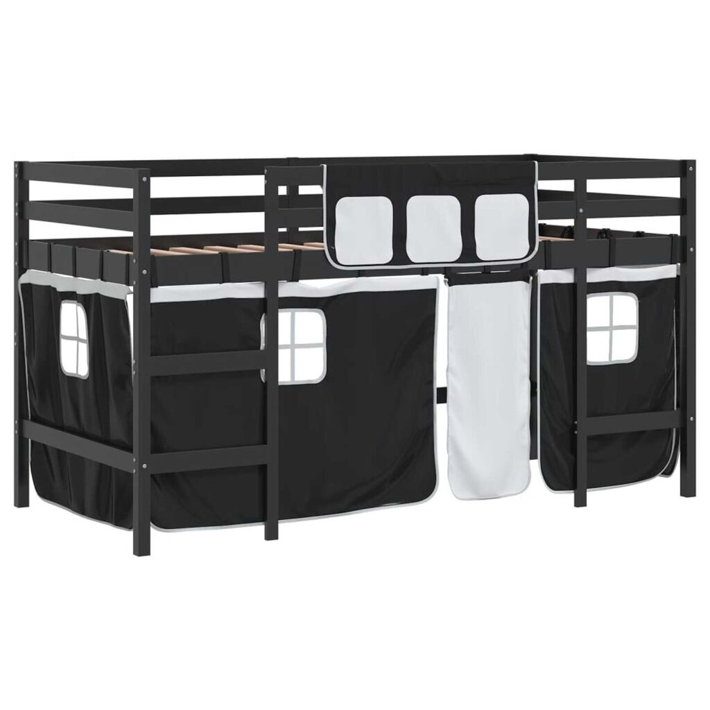 vidaXL højseng med gardiner 90x200 cm massivt fyrretræ hvid og sort