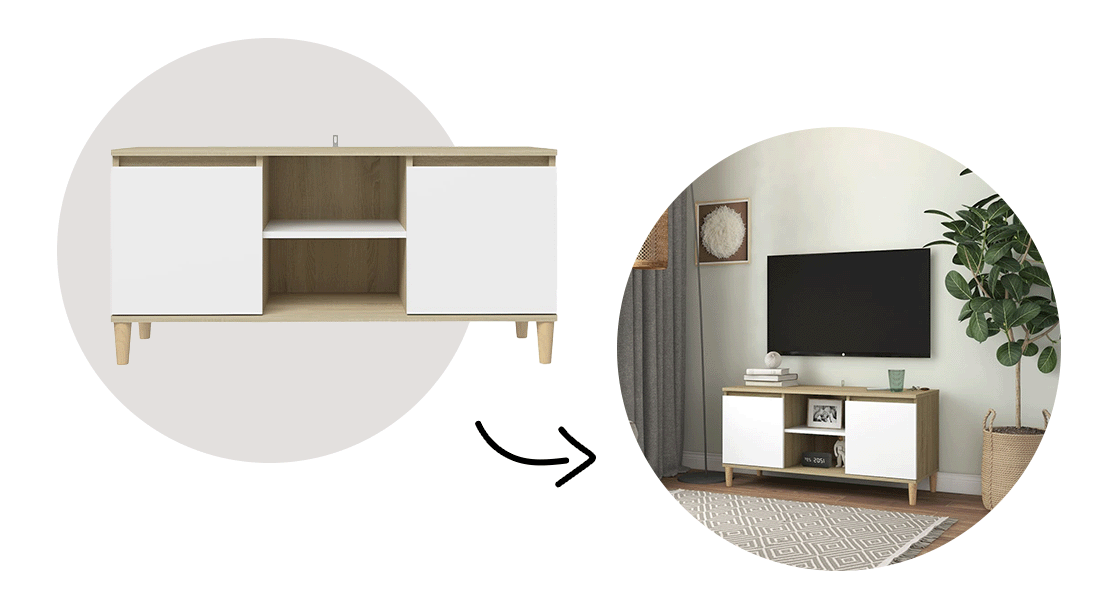 Gå efter rene linjer, ryddelige omgivelser og en neutral farvepalet for at skabe en fredfyldt stemning. Det kan f.eks. være en tv-enhed, der kombiner en naturlig træstruktur med hvide låger. Opbevar dine ting bag lågerne for en ryddelig fornemmelse, men lad et par ting stå på de åbne hylder for at skabe lidt farve.