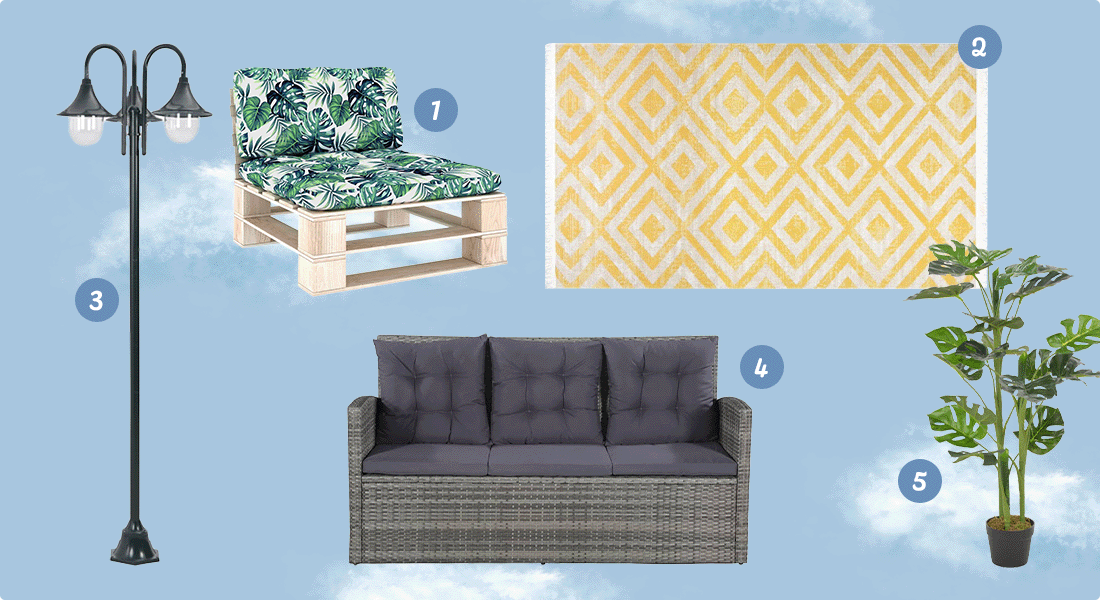 Led efter farverige hynder, teksturerede gulvtæpper, flotte lyskæder og potteplanter. Disse enkle præg vil forvandle din stue under åben himmel til en afslapningsoase, uden at det vælter budgettet.