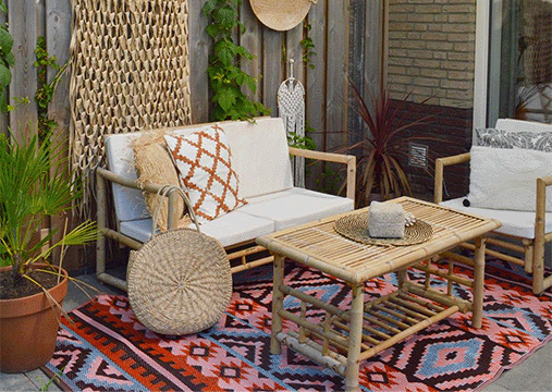 Skab harmoni i din stue under åben himmel med naturlige materialer. Disse produkter til en udendørs stue er musthaves, hvad enten det er rustikke møbler i træ, sten, bambus eller jute.